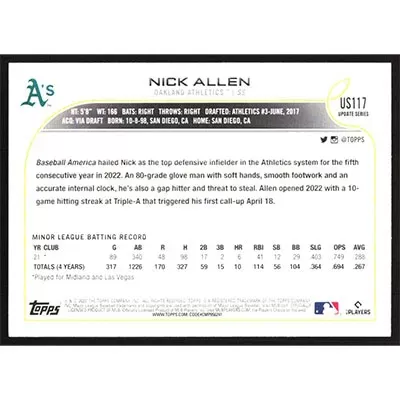 This is a 2022 Topps Update Nick Allen baseball card. The card is #US117 and pictures show condition.