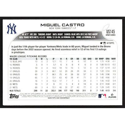This is a 2022 Topps Update Miguel Castro baseball card. The card is #US145 and pictures show condition.