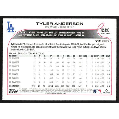This is a 2022 Topps Update Tyler Anderson baseball card. The card is #US190 and pictures show condition.