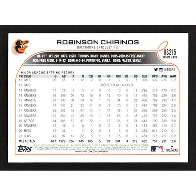 This is a 2022 Topps Update Robinson Chirinos baseball card. The card is #US215 and pictures show condition.