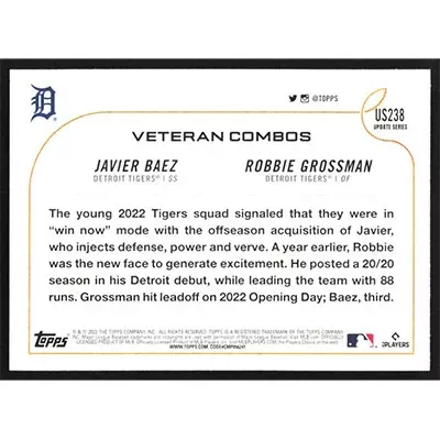 This is a 2022 Topps Update Javier Baez and Robbie Grossman Veteran Combos Dancing in Detroit baseball card. The card is #US238 and pictures show condition.
