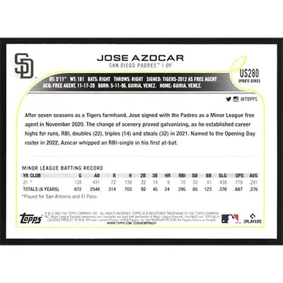 This is a 2022 Topps Update Jose Azocar baseball card. The card is #US280 and pictures show condition.