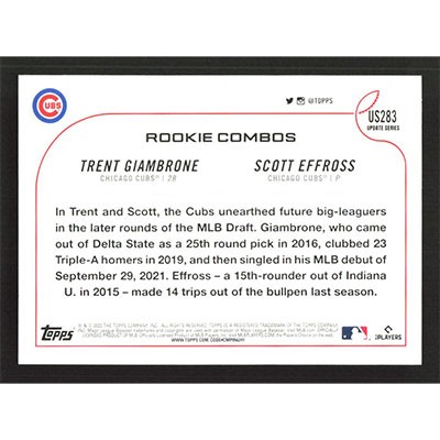 This is a 2022 Topps Update Trent Giambrone and Scott Effross Rookie Combos baseball card. The card is #US283 and pictures show condition. Team(s): Chicago Cubs Rookie Card (RC)