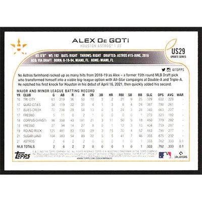 This is a 2022 Topps Update Alex De Goti baseball card. The card is #US29 and pictures show condition.