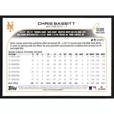 This is a 2022 Topps Update Chris Bassitt baseball card. The card is #US305 and pictures show condition.