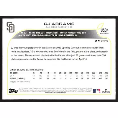 This is a 2022 Topps Update CJ Abrams baseball card. The card is #US34 and pictures show condition.