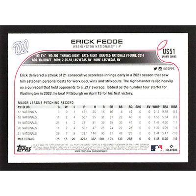 This is a 2022 Topps Update Erick Fedde baseball card. The card is #US51 and pictures show condition.
