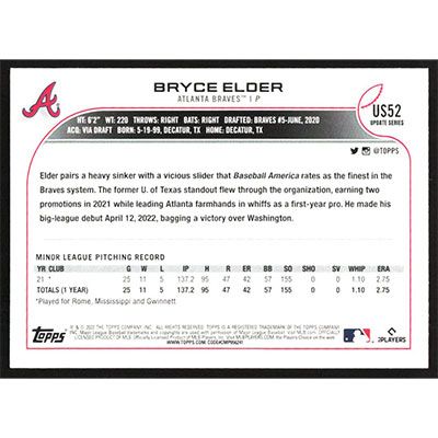This is a 2022 Topps Update Bryce Elder baseball card. The card is #US52 and pictures show condition.