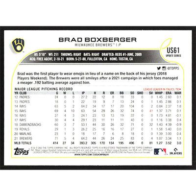 This is a 2022 Topps Update Brad Boxberger baseball card. The card is #US61 and pictures show condition.