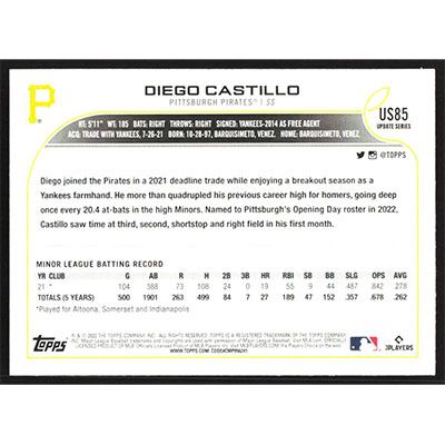 This is a 2022 Topps Update Diego Castillo baseball card. The card is #US85 and pictures show condition.