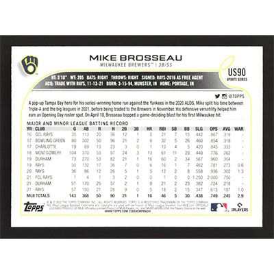 This is a 2022 Topps Update Mike Brosseau baseball card. The card is #US90 and pictures show condition.