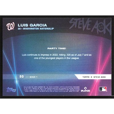This is a 2022 Topps x Steve Aoki's Baseball Party Luis Garcia baseball card. The card is #50 and pictures show condition. Team(s): Washington Nationals