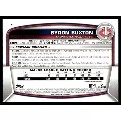 This is a 2023 Bowman Byron Buxton baseball card. The card is #1 and is in NM-MT condition.