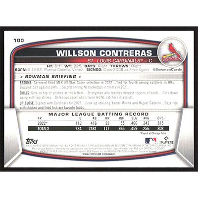 This is a 2023 Bowman Willson Contreras baseball card. The card is #100 and pictures show condition.