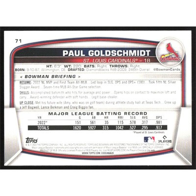 This is a 2023 Bowman Paul Goldschmidt baseball card. The card is #71 and pictures show condition.