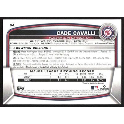 This is a 2023 Bowman Cade Cavalli baseball card. The card is #94 and pictures show condition.