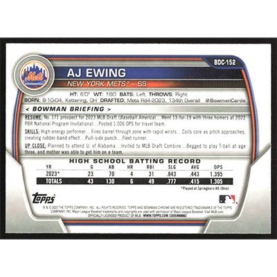 This is a 2023 Bowman Chrome Draft AJ Ewing baseball card. The card is #BDC-152 and pictures show condition.
