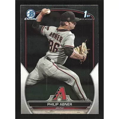 This is a 2023 Bowman Chrome Draft Philip Abner baseball card. The card is #BDC-165 and pictures show condition.