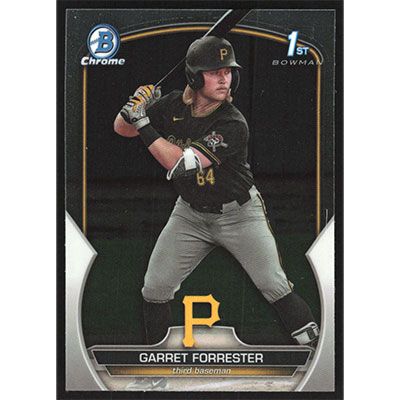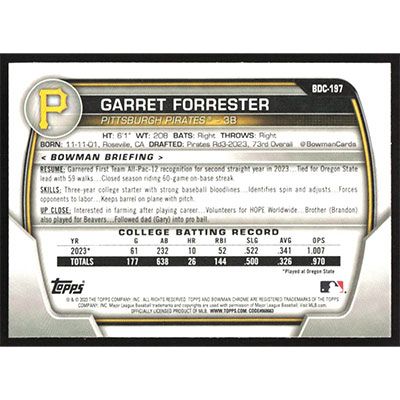 This is a 2023 Bowman Chrome Draft Garret Forrester baseball card. The card is #BDC-197 and pictures show condition.