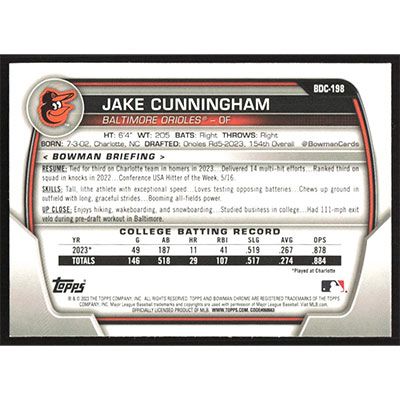 This is a 2023 Bowman Chrome Draft Jake Cunningham baseball card. The card is #BDC-198 and pictures show condition.