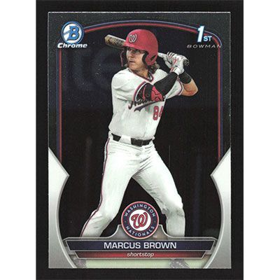 This is a 2023 Bowman Chrome Draft Marcus Brown baseball card. The card is #BDC-26 and pictures show condition.