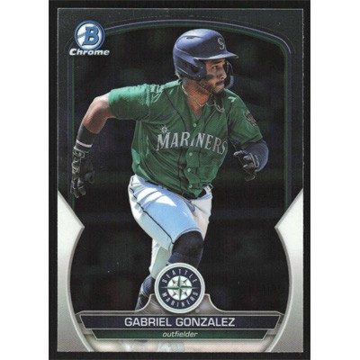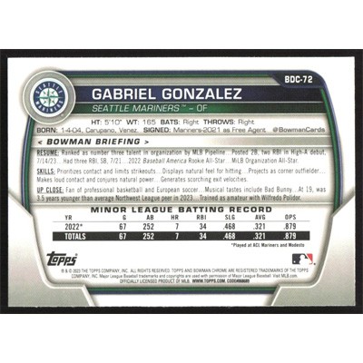 This is a 2023 Bowman Chrome Draft Gabriel Gonzalez baseball card. The card is #BDC-72 and pictures show condition.