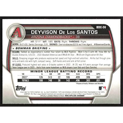 This is a 2023 Bowman Chrome Draft Lunar Glow Refractors Deyvison De Los Santos baseball card. The card is #BDC-36 and pictures show condition. Team(s): Arizona Diamondbacks