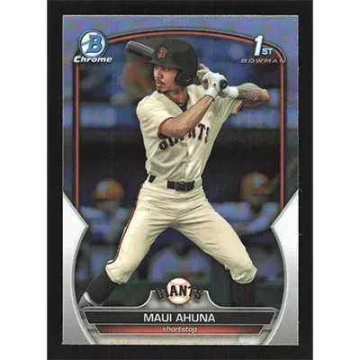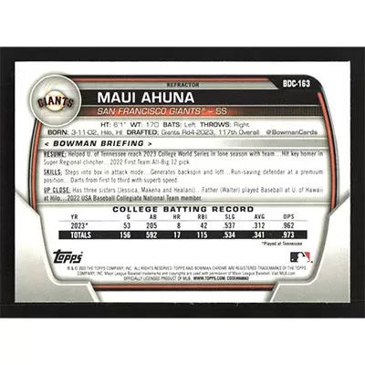 This is a 2023 Bowman Chrome Draft Refractors Maui Ahuna baseball card. The card is #BDC-163 and pictures show condition.