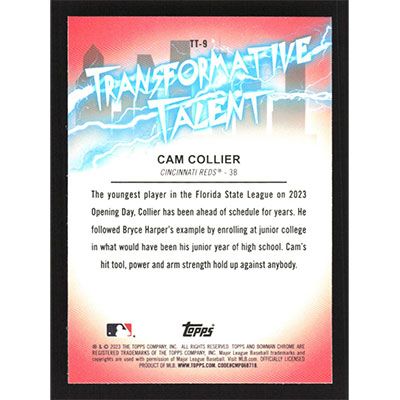 This is a 2023 Bowman Chrome Draft Transformative Talent Cam Collier baseball card. The card is #TT-9 and pictures show condition. Team(s): Cincinnati Reds