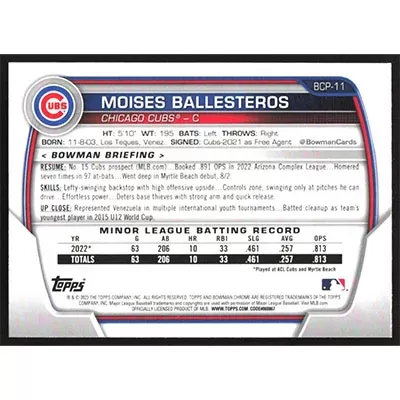 This is a 2023 Bowman Chrome Mega Box Prospects Moises Ballesteros baseball card. The card is #BCP-11 and pictures show condition.