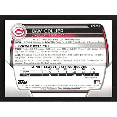 This is a 2023 Bowman Chrome Mega Box Prospects Cam Collier baseball card. The card is #BCP-125 and pictures show condition.