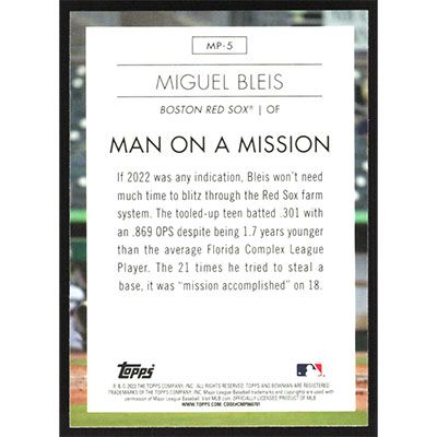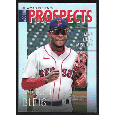 This is a 2023 Bowman Chrome Modern Prospects Miguel Bleis baseball card. The card is #MP-5 and pictures show condition.