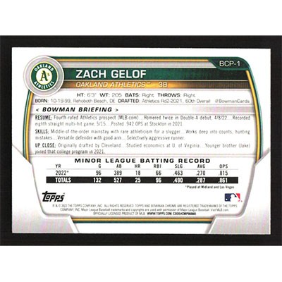 This is a 2023 Bowman Chrome Prospects Zack Gelof baseball card. The card is #BCP-1 and pictures show condition.