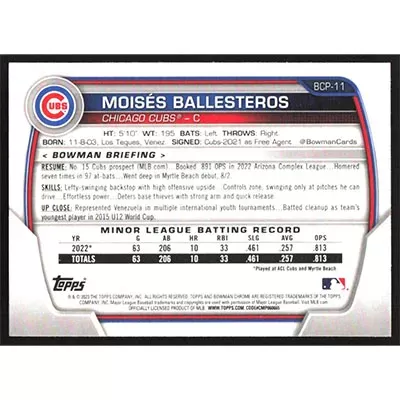 This is a 2023 Bowman Chrome Prospects Moises Ballesteros baseball card. The card is #BCP-11 and pictures show condition.