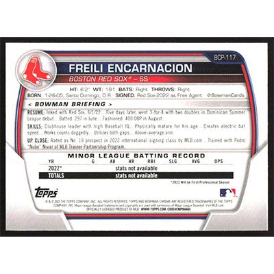 This is a 2023 Bowman Chrome Prospects Freili Encarnacion baseball card. The card is #BCP-117 and pictures show condition.