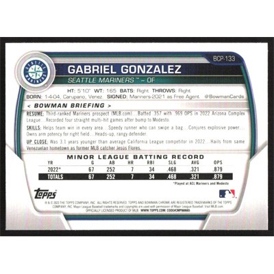 This is a 2023 Bowman Chrome Prospects Gabriel Gonzalez baseball card. The card is #BCP-133 and pictures show condition.