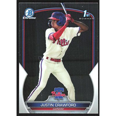 This is a 2023 Bowman Chrome Prospects Justin Crawford baseball card. The card is #BCP-3 and pictures show condition.