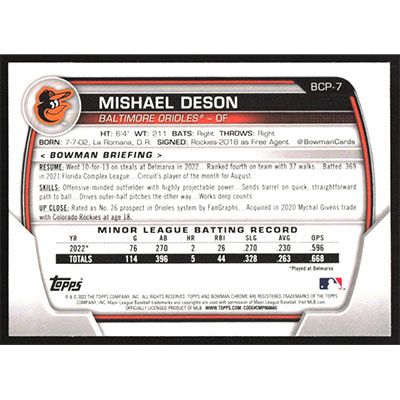 This is a 2023 Bowman Chrome Prospects Mishael Deson baseball card. The card is #BCP-7 and pictures show condition.