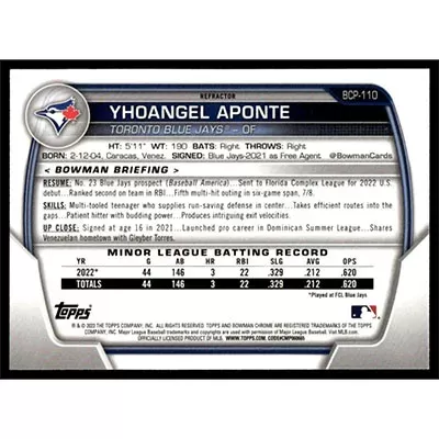 This is a 2023 Bowman Chrome Prospects Lunar Glow Refractors Yhoangel Aponte baseball card. The card is #BCP-110 and pictures show condition. Team(s): Toronto Blue Jays