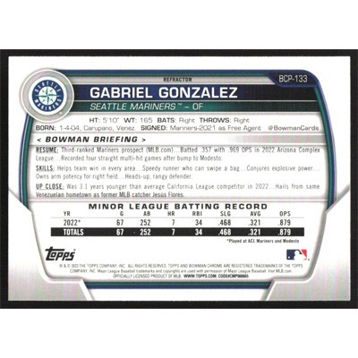 This is a 2023 Bowman Chrome Prospects Lunar Glow Refractors Gabriel Gonzalez baseball card. The card is #BCP-133 and pictures show condition. Team(s): Seattle Mariners