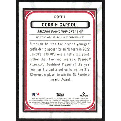 This is a 2023 Bowman Chrome Rookie of the Year Favorites Corbin Carroll baseball card. The card is #ROYF-1 and pictures show condition. Team(s): Arizona Diamondbacks Rookie Card (RC)