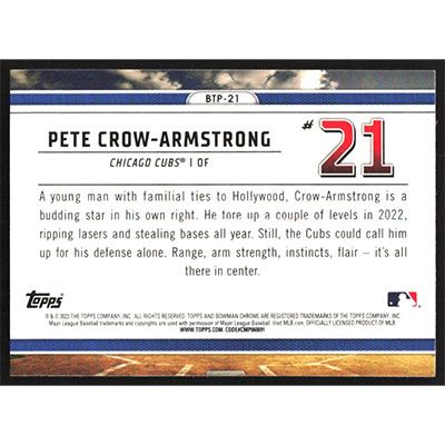 This is a 2023 Bowman Chrome Scouts Top 100 Pete Crow-Armstrong baseball card. The card is #BTP-21 and pictures show condition.