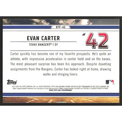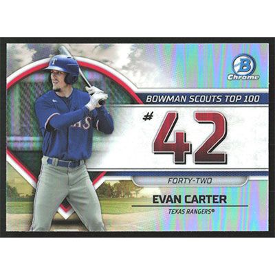 This is a 2023 Bowman Chrome Scouts Top 100 Evan Carter baseball card. The card is #BTP-42 and pictures show condition.