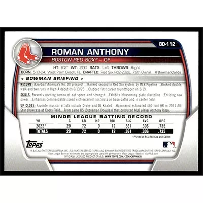 This is a 2023 Bowman Draft Roman Anthony baseball card. The card is #BD-112 and pictures show condition.