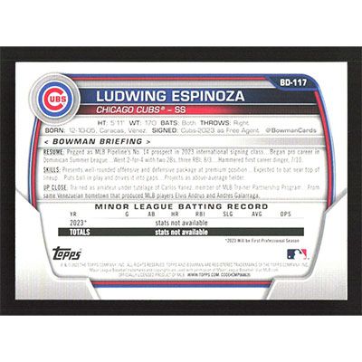 This is a 2023 Bowman Draft Ludwing Espinoza baseball card. The card is #BD-117 and pictures show condition.