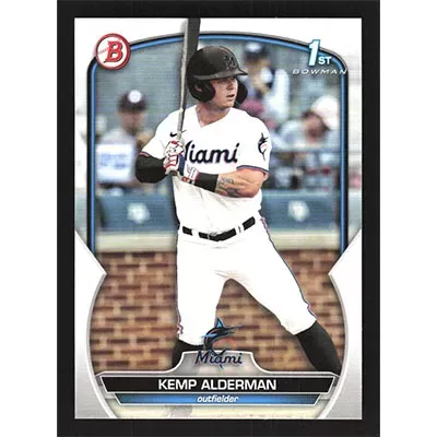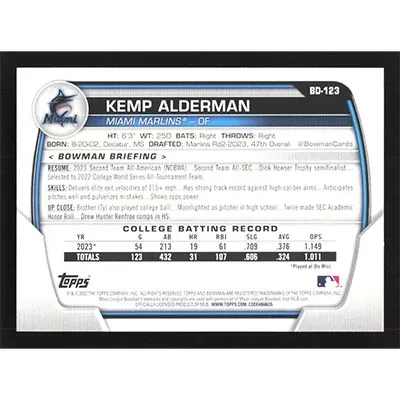 This is a 2023 Bowman Draft Kemp Alderman baseball card. The card is #BD-123 and pictures show condition.