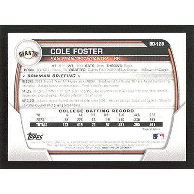 This is a 2023 Bowman Draft Cole Foster baseball card. The card is #BD-128 and pictures show condition.