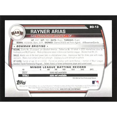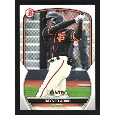 This is a 2023 Bowman Draft Rayner Arias baseball card. The card is #BD-13 and pictures show condition.