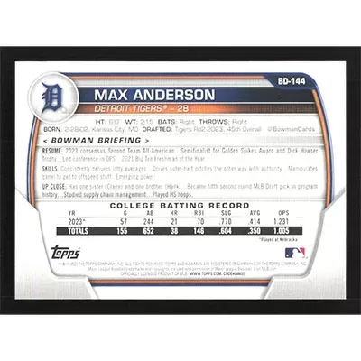 This is a 2023 Bowman Draft Max Anderson baseball card. The card is #BD-144 and pictures show condition.