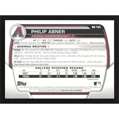 This is a 2023 Bowman Draft Philip Abner baseball card. The card is #BD-165 and pictures show condition.